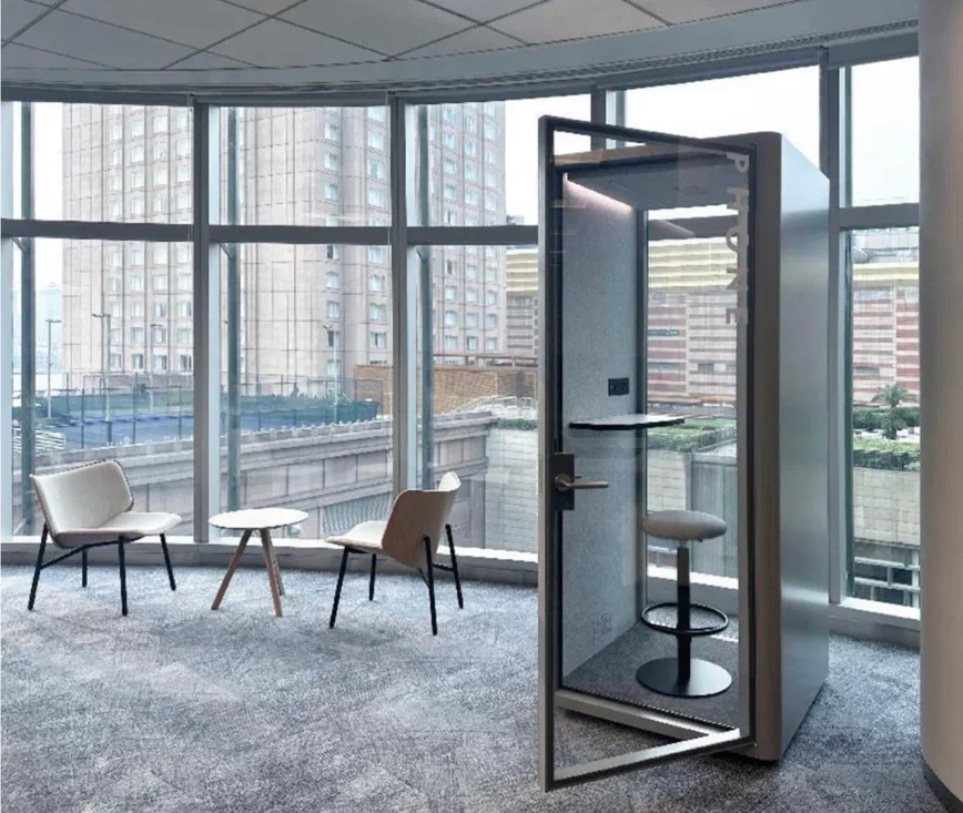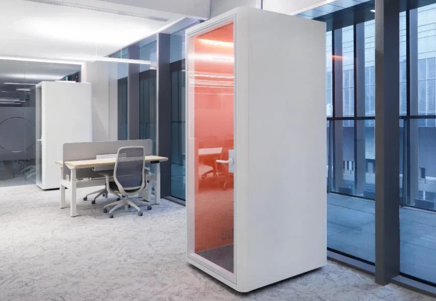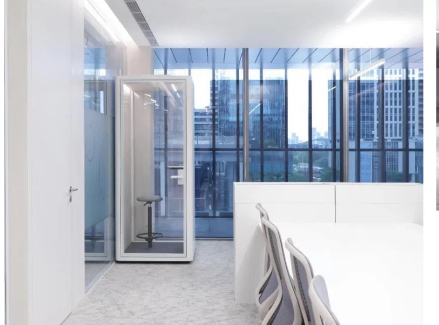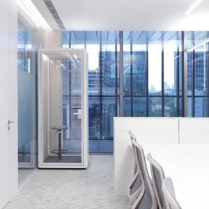 Звукопоглощение до 30 dB. На полу стандартный темно-серый коворлин. Дверь 11mm стекло со скрытой рамой Освещение 8В полоса света с 2-х сторон; 8В полос по середине.