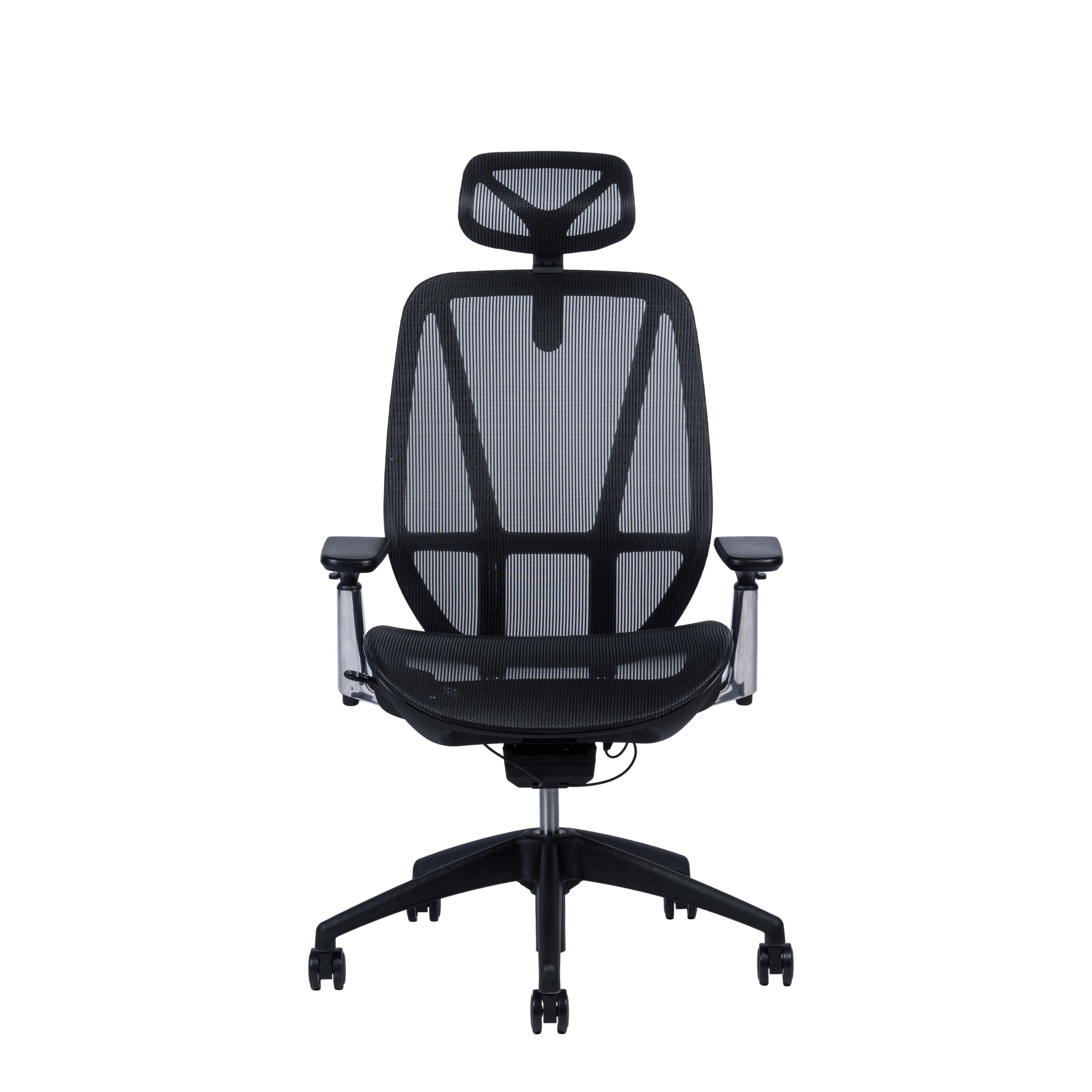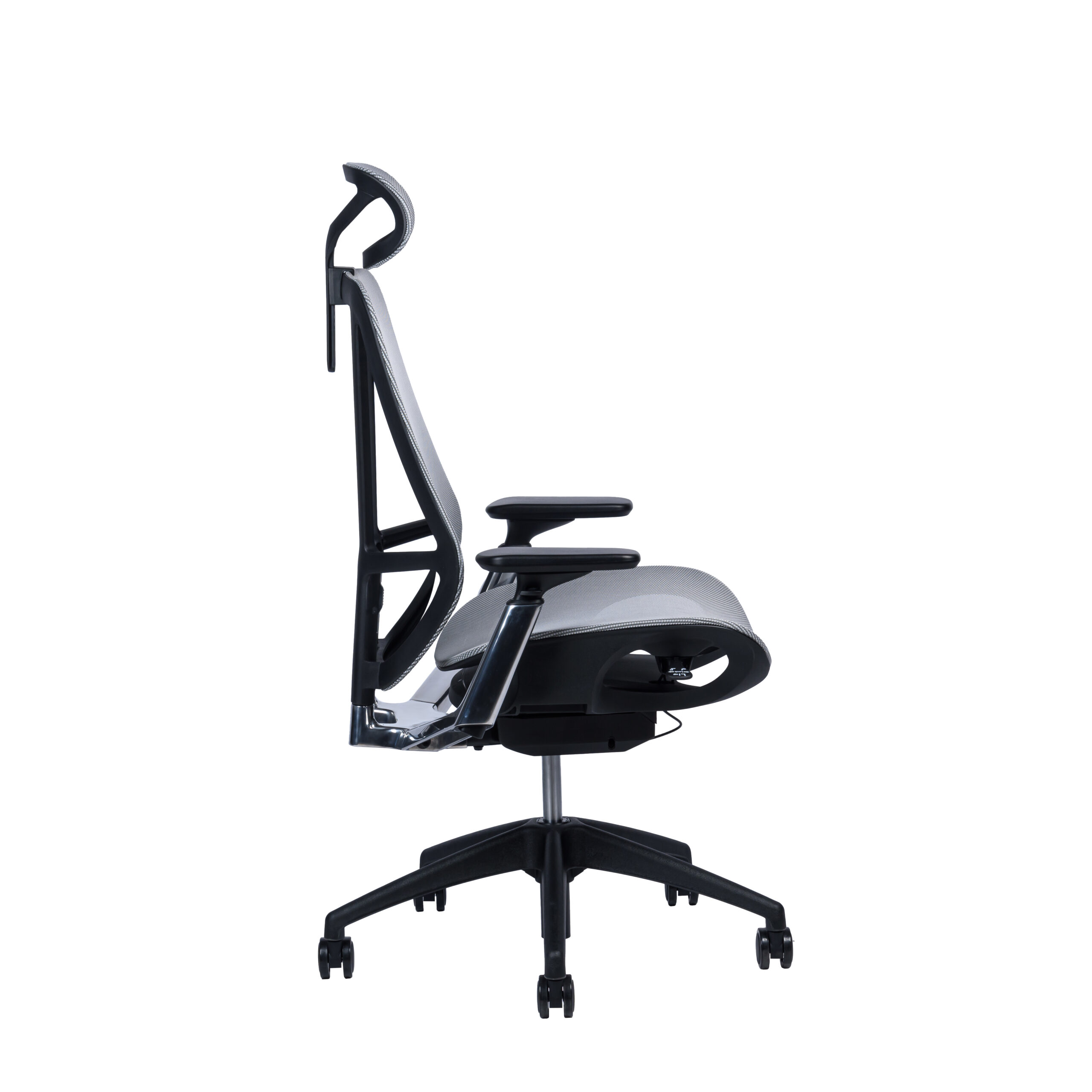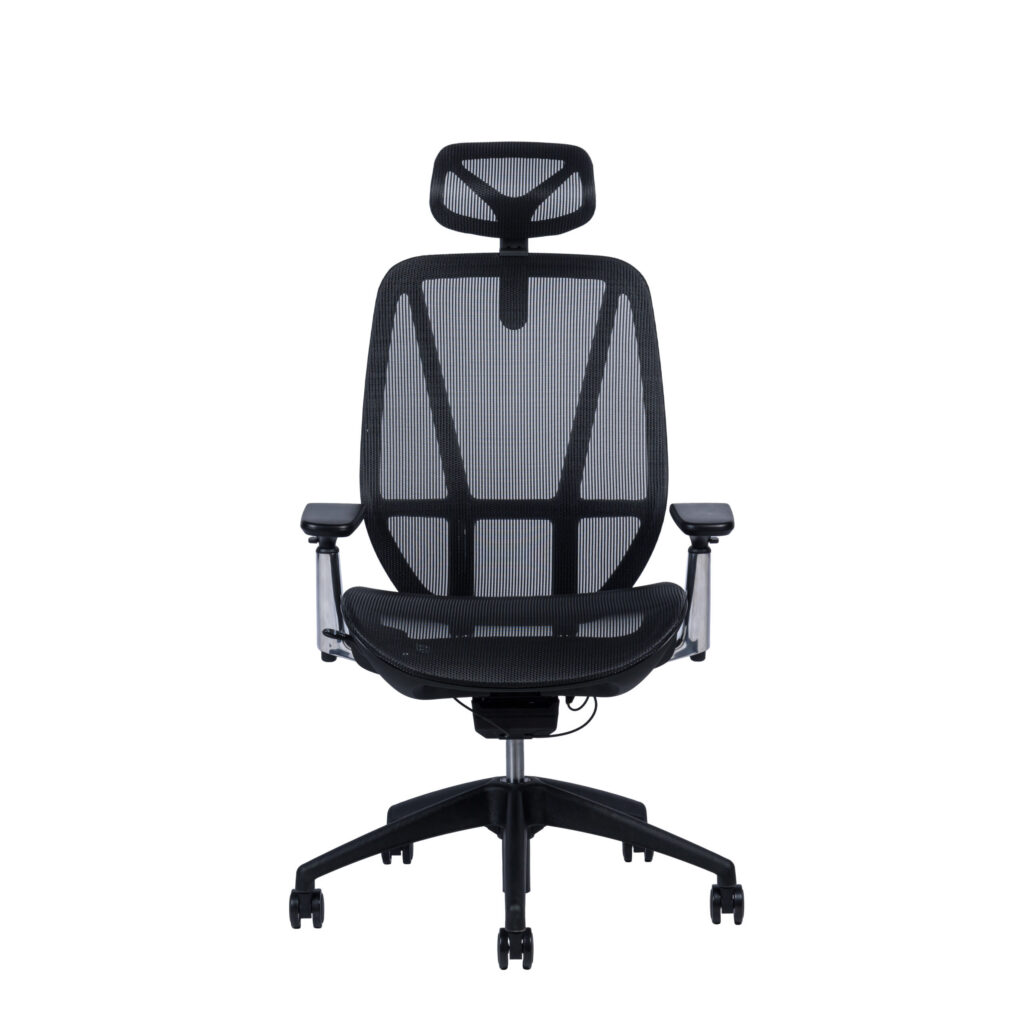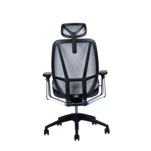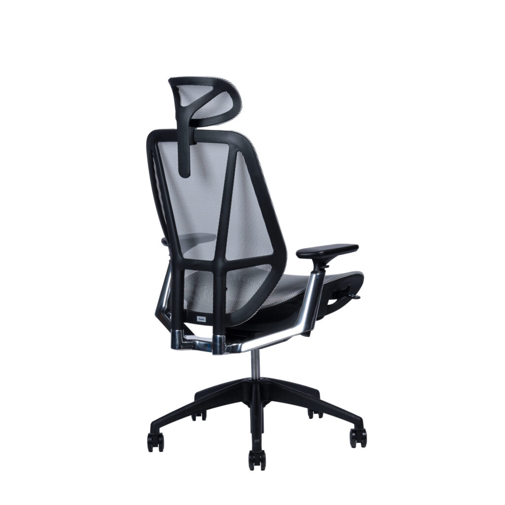 Черный подголовник регулируется по высоте, черная спинка регулируется по высоте, алюминиевые подлокотники с черной мягкой накладкой регулируются по высоте, ширине, вперед-назад.