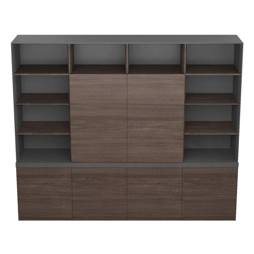 Шкаф для документов 2530*430*2130мм. Материал — МДФ, класса Е0, 40мм облицованный шпоном. Фасады распашные, покрытие — шпон. Регулировка неровности пола.