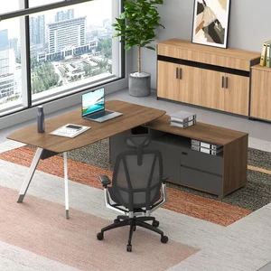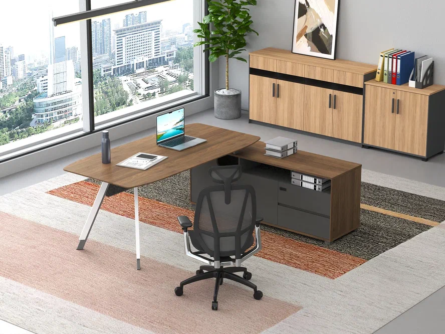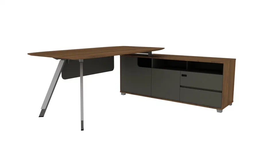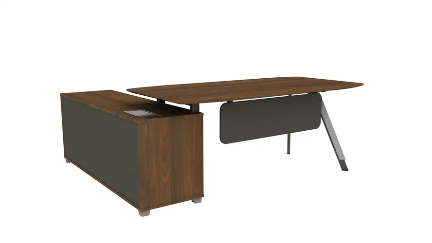 Стол руководителя 2000*1800*750 мм на опорной правой тумбе. Меламин класса E0, кромка PVC, толщина рабочего стола 25 мм.